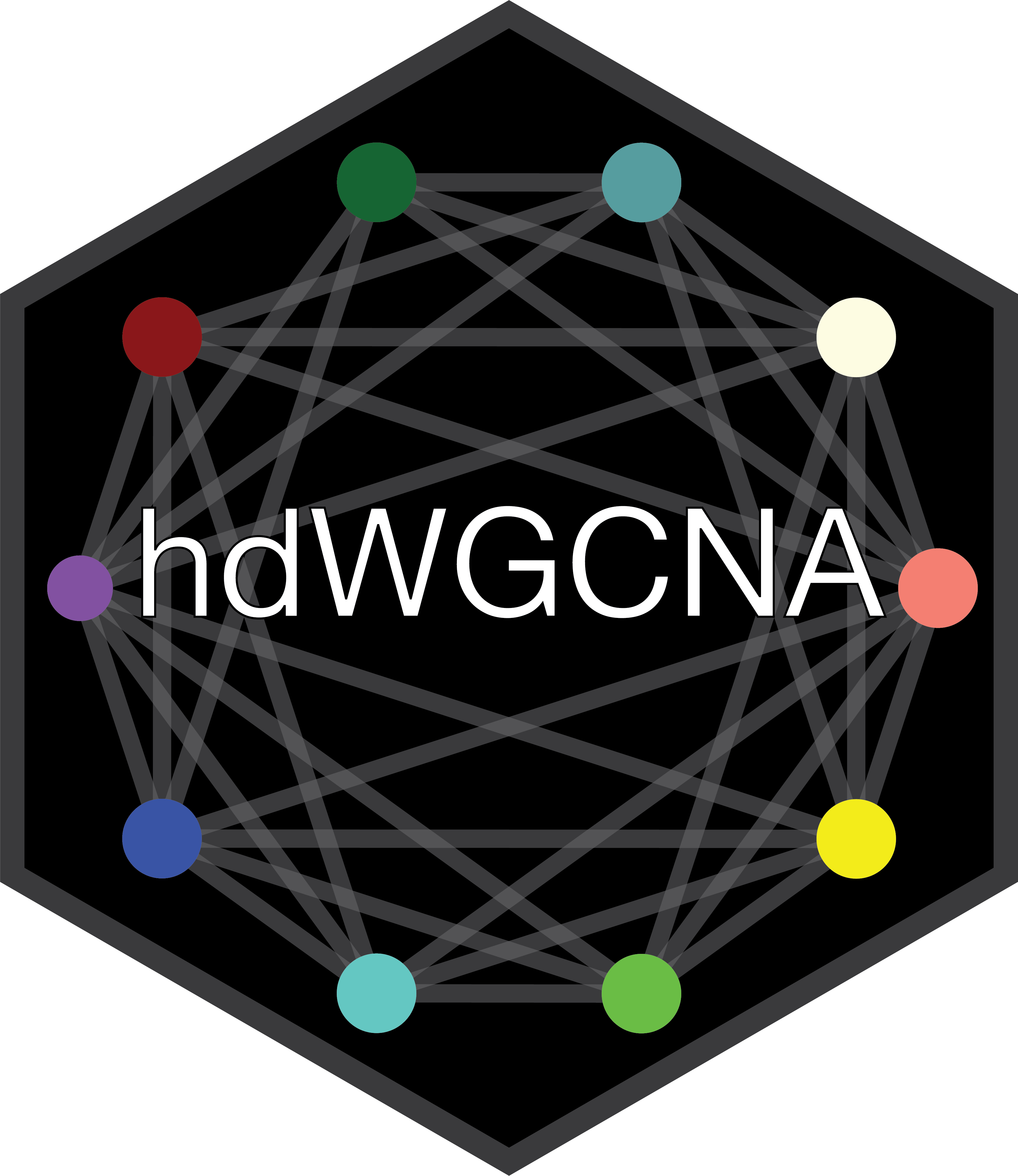 hdWGCNA is an R package for performing weighted gene co-expression network analysis [WGCNA] in high dimensional transcriptomics data such as single-cell RNA-seq or spatial transcriptomics. hdWGCNA is highly modular and can construct context-specific co-expression networks across cellular and spatial hierarchies. hdWGNCA identifies modules of highly co-expressed genes and provides context for these modules via statistical testing and biological knowledge sources. hdWGCNA uses datasets formatted as [Seurat] objects.